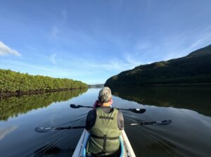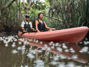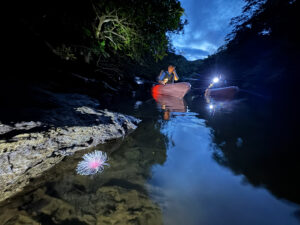 私たちは、他のショップよりも一足早く出発します。その理由は、誰にも邪魔されずに、静寂の中でゆっくりとサガリバナを眺めていただきたいからです。まだ暗いマングローブの中、パドルを漕ぐ音だけが響く贅沢な時間。