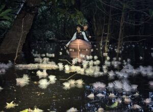 夜に咲いて早朝には散ってしまうサガリバナ。落ちた花たちはマングローブの川にふわりと浮かび